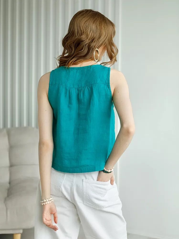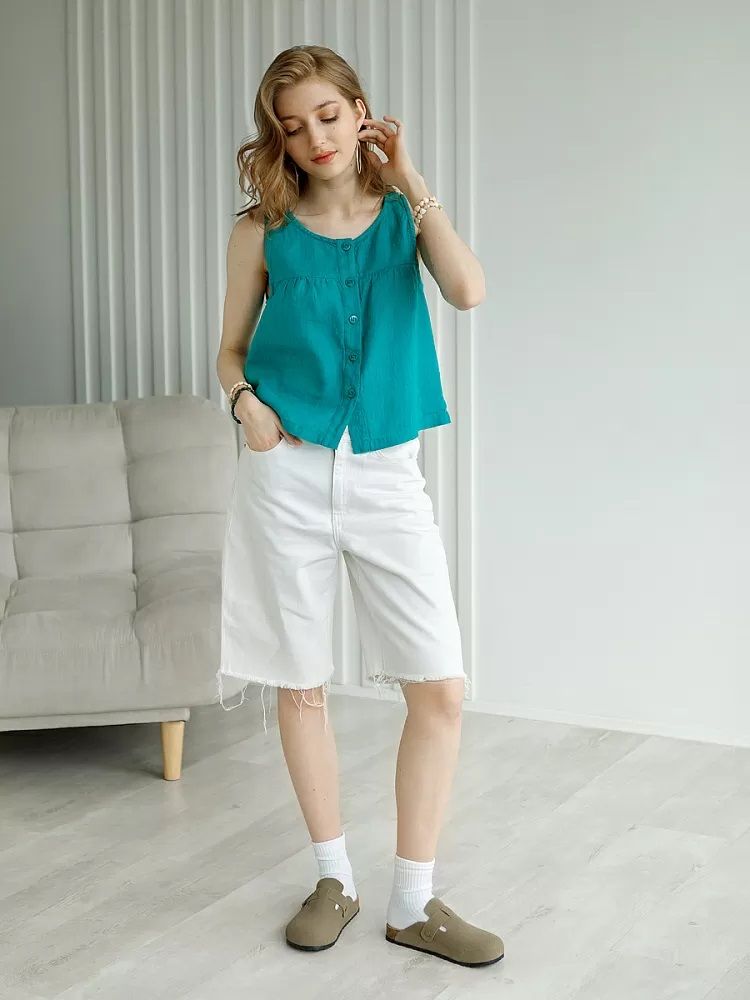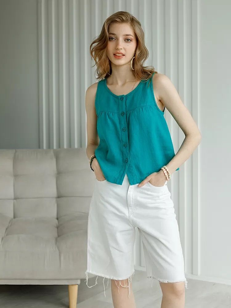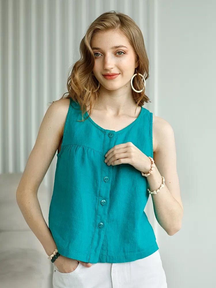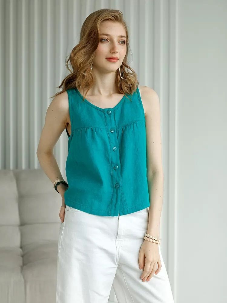 Базовый летний топ – это всегда актуальное приобретение. Присмотритесь к представленной модели! В виду натурального льна и конструкторских особенностей его можно использовать также и как самостоятельное изделие. Небольшая подсказка от наших дизайнеров – особо удачными сочетаниями станут со свободными брюками и юбками ниже колена. Небольшая длина топа позволит во всей полноте использовать функционал поясных изделий, а также продемонстрировать их дизайн. Монохромный цвет модели и неброский декор позволят с лёгкостью вписать её в любой дуэт с жакетом, кардиганом и пыльником. Отсутствие рукавов и округлый вырез горловины не вызовут дискомфорта под ними. Центральная застёжка – планка на пуговицы и присборенность – придают образу топа нежности, романтики и чуть наивности. Натуральный лён прекрасное «дополнение» ко всем преимуществам этой модели. Этот материал хорошо отводит влагу и вентилирует воздух, благодаря чему вы будете чувствовать себя великолепно даже в самый знойный день. Цветовая палитра модели также порадует богатым выбором.