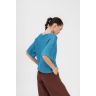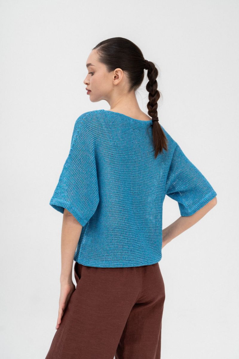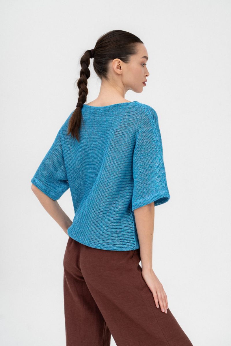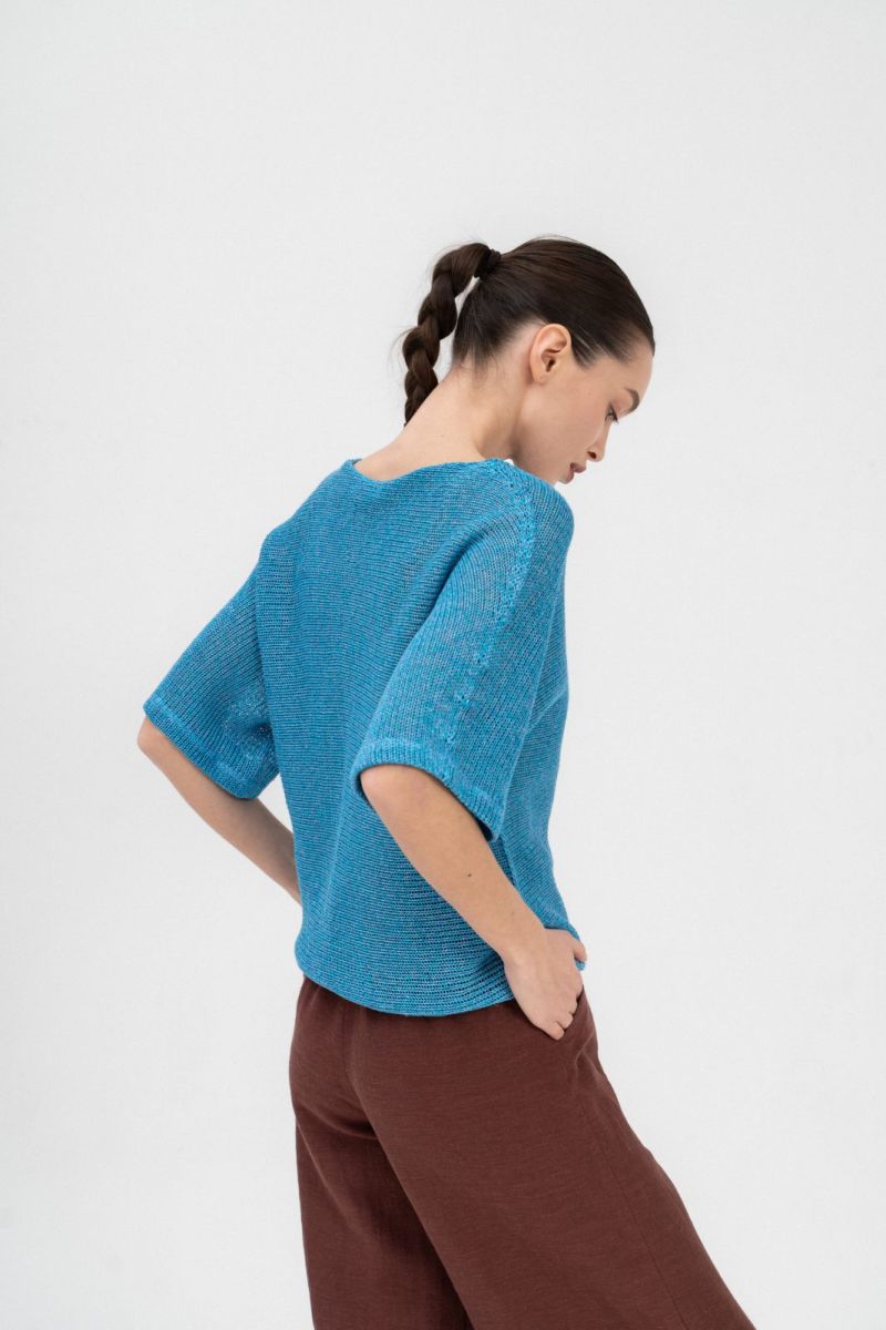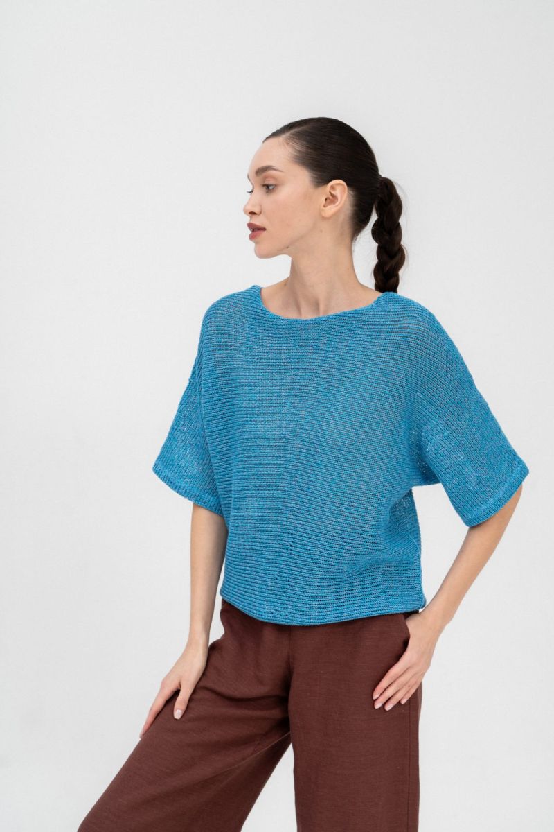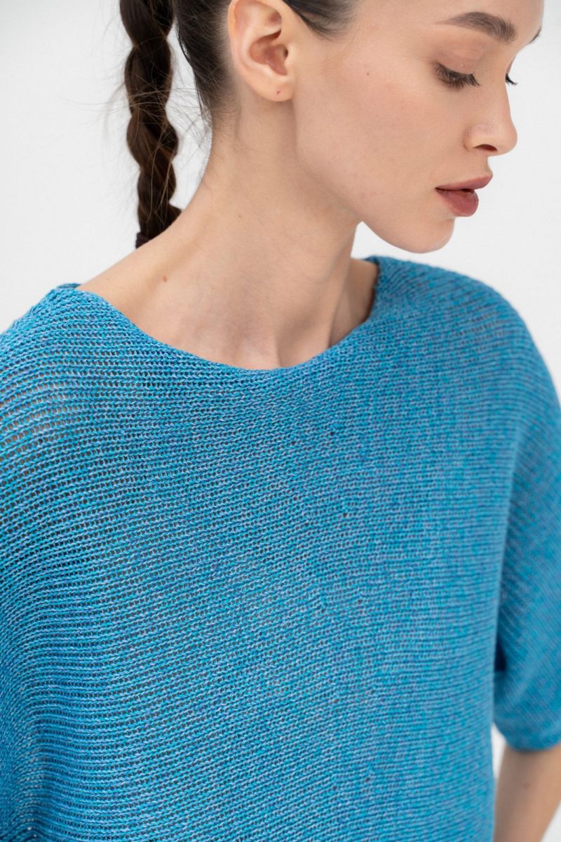 Джемпер женский цельновязаный без боковых и плечевых швов с расширенным объемом в верхней части. Рукав цельнокроеный короткий. Вырез горловины округлой формы.