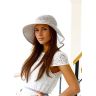 Головной убор женский комбинированный из полульняной ткани и льняного трикотажного полотна с небольшим опущенным вниз полем. На тулье использовано льняное трикотажное полотно, что делает данный головной убор еще более комфортным в носке за счет хорошей вентиляции. Размер регулируется сзади завязками.