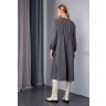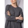Платье в стиле «бохо» выполнено из богатой ткани с жатой фактурой в тонкую изящную полоску. Благородный серый оттенок торфа и декоративные шнурочки в тон.
