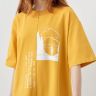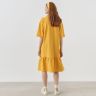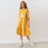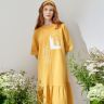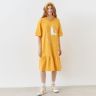 Платье, трапециевидного силуэта, свободное. Горловина круглая, оформлена асимметричной притачной обтачкой. По спинке закреплена киперной лентой. Плечо спущенное. Рукав втачной, широкий. Полочка со средним швом, центральная часть полочки декорирована принтом. По низу платья волан.