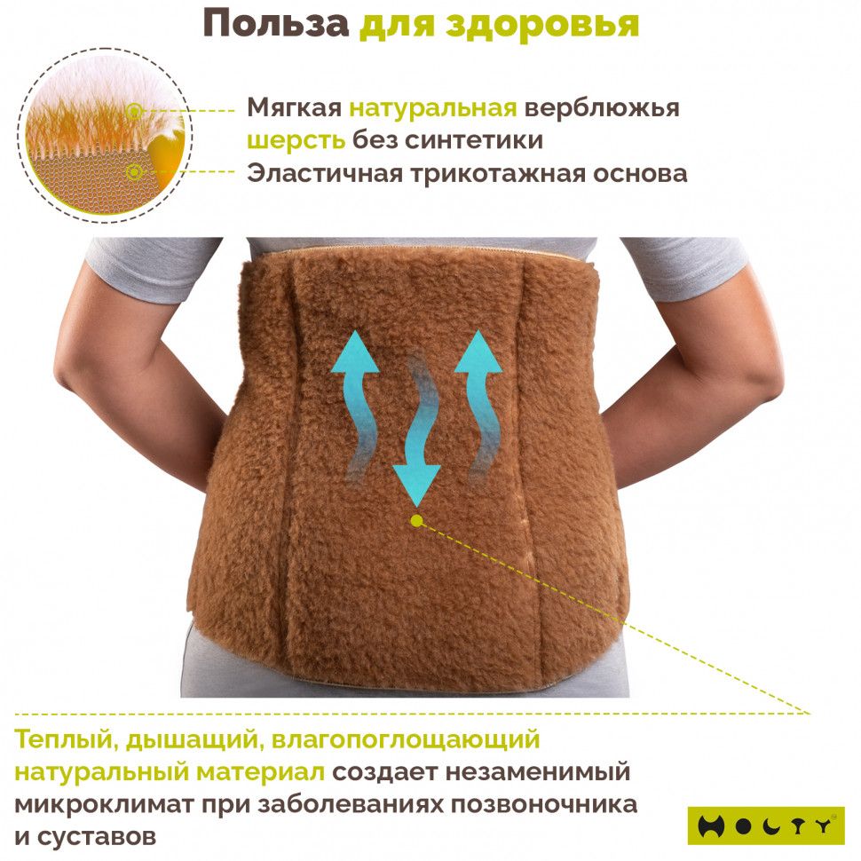 Пояс для спины из шерсти оказывает тепловой баланс и деликатное массажное воздействие, которые усиливают кровообращение, способствуя ускорению восстановления тканей;