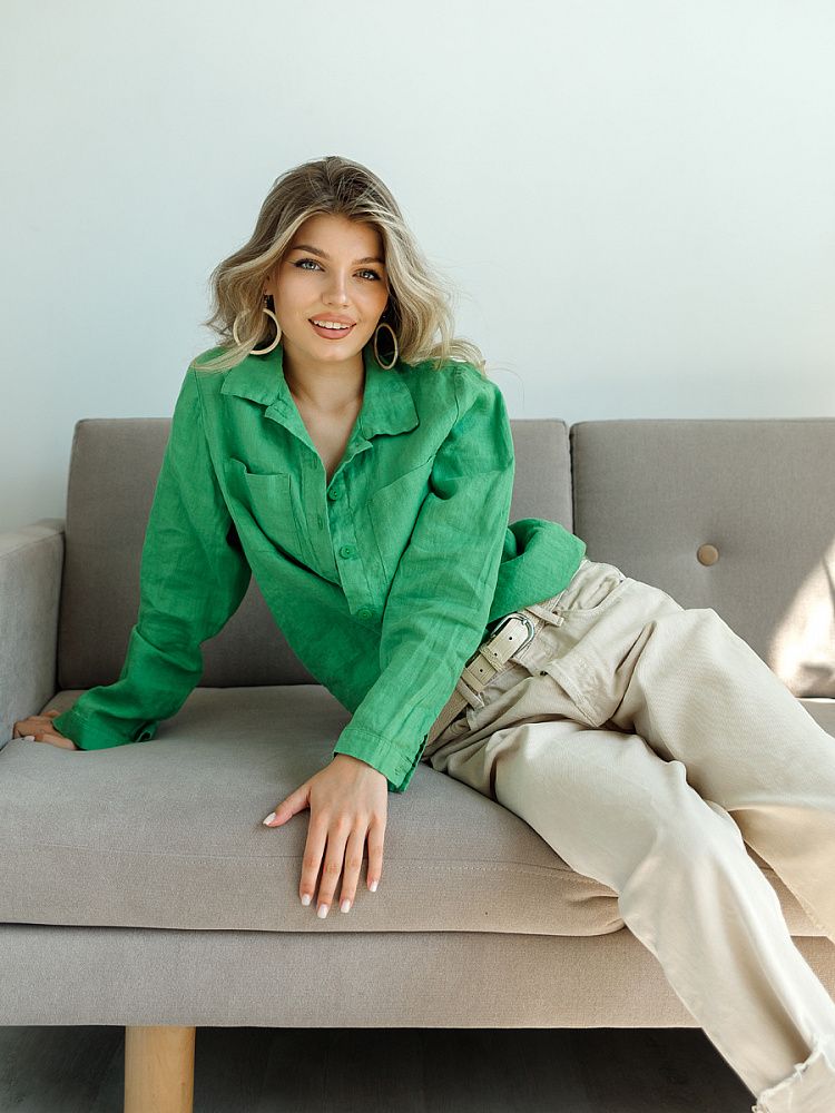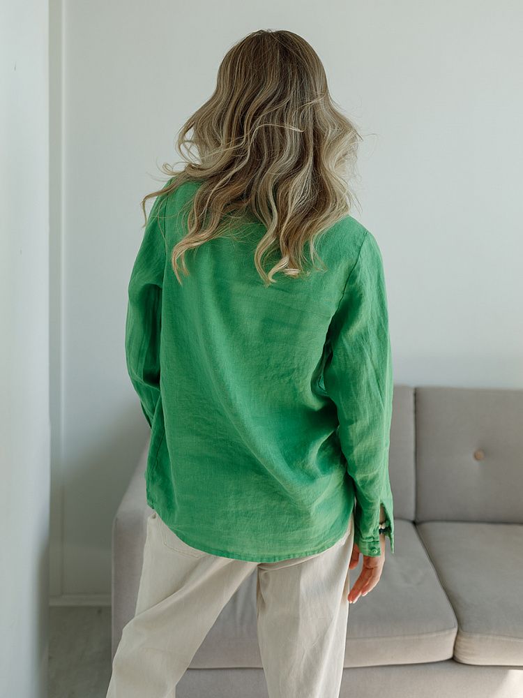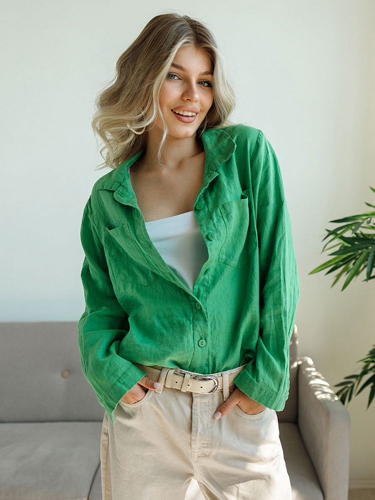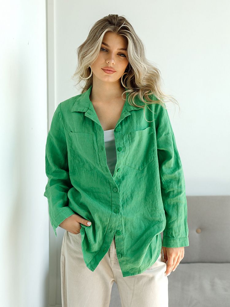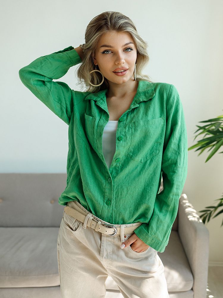 Модель мужской сорочки со всеми характерными элементами – заслуженно занимает почётное место в женских гардеробах. Благодаря своей универсальности она полюбилась представительницами женского пола самых разных возрастов, комплекций и стилевых пристрастий. Давайте разберёмся почему, на примере представленной модели блузы! Прямой свободный крой прекрасно можно сочетать как джинсами, так и с юбками. Её можно носить как поверх поясного изделия, так и на выправку. Креативные натуры могут пойти дальше, сформировав стильный узел из бортов рубашки. Большие накладные карманы выступают в качестве обязательного атрибута рубашек в стиле casual, подчёркивая практичную направленность данного стиля. Стояче - отложной воротник, центральная планка на пуговицы и манжеты по низу рукавов – без всех этих декоративных элементов невозможно себе представить интерпретацию мужской сорочки. Жатая текстура натурального льна не только демонстрирует «яркий характер» модели, но позволяет использовать её поверх любого кроп-топа или футболки.