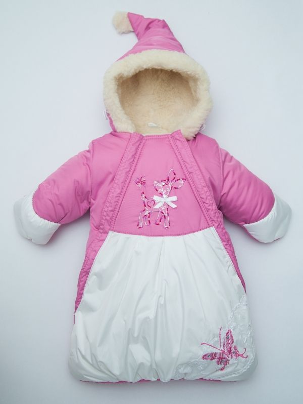 Зимний конверт на натуральной овчине предназначен для девочек от рождения. Застежка на две молнии, закрытые планками. Капюшон колпак с меховым помпоном, затягивается по окату шнурком с затяжниками. Окантовка края капюшона из овчины. Внутренние подпланки с липучкой на груди защищают горло от продувания. На рукавах цельнокроеные манжеты на резинке. Передняя часть конверта из двух частей: верхняя с вышивкой, нижняя с 3 складками по верхнему краю и со сборкой по нижнему краю, что обеспечивает свободу движения ножек малыша. Вышивка с олененком, украшена кружевом и стразами. Подкладка - трикотажное полотно из натуральной 100% овечьей шерсти; вшита, не съемная.